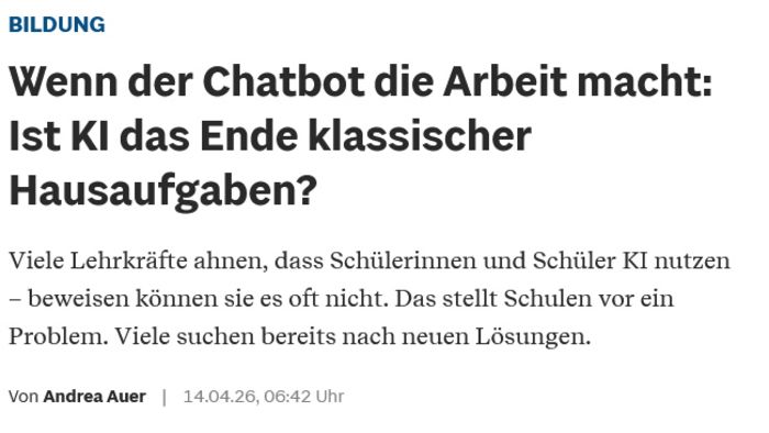 Zugespitzt auf das Thema Hausaufgaben hat jetzt die Augsburger Allgemeine das Thema nochmal aufgegriffen: “Wenn der Chatbot die Arbeit macht: Ist KI das Ende klassischer Hausaufgaben?” – so die provokante Frage der Redaktion. Denn die Lehrkräfte wissen natürlich, dass viele Schülerinnen und Schüler KI nutzen. Das stellt viele Schulen vor ein Problem. Die Frage ist natürlich ob es das muss. Schließlich ist es doch egal, ob der Papa, die Oma oder die KI die Hausaufgabe macht, oder? Diese Unsicherheit gab es immer. Womit wir wieder beim Sinn oder Unsinn von Hausaufgaben wären. Dass man die Frage jetzt noch dringlicher und klarer stellen muss, kann schließlich auch eine Chance füpr einen zukunftsfähigen Lernbegriff sein.