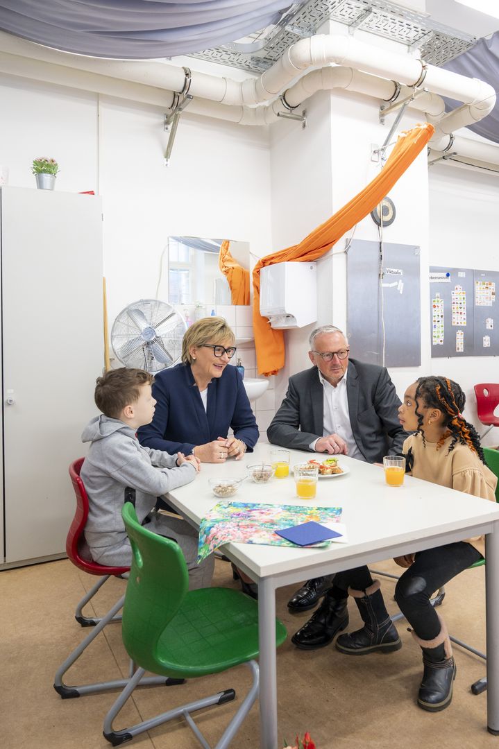 BLLV-Präsidentin Simone Fleischmann kennt das Schulfrühstück natürlich schon sehr lange, ist aber immer wieder begeistert davon, es live zu erleben. Der Besuch macht aber auch sie nachdenklich: “Wenn im vergleichsweise reichen Bayern immer betont wird, wie viel Geld für die Bildung ausgegeben wird und wie exzellent wir hier aufgestellt sind, dann müssen wir uns auch mal fragen was genau das für die Kinder und Jugendlichen bedeutet. Und wir müssen uns fragen, wo das Geld ankommt, wofür es ausgegeben wird und wie es bei uns mit der Bildungsgerechtigkeit steht. Da kann jeder Bildungspolitiker gerne mal zu uns zum Schulfrühstück kommen und selbst sehen, wie viele Kinder es gibt, die viel mehr Unterstützung und Förderung bräuchten. Und zwar ganz umfassend, denn vielen Kindern fehlt es auch in Bayern an allem – an einem Frühstück und einer gesunden Ernährung genauso, wie an der individuellen Förderung oder Lernbegleitung und einer menschlichen und persönlichen Fürsorge. Hier vor Ort kann man genau sehen, wie alle zusammen eine Gemeinschaft bilden. Und die Kinder und Jugendlichen helfen mit. Frühstückslotsinnen, Lehrkräfte und Spender geben hier alles für die Schülerinnen und Schüler, aber viele Kinder an vielen Schulen bräuchten noch so viel mehr um gut ins Leben zu kommen. Das dürfen wir bei der ganzen Lobhudelei im bayerischen Bildungssystem nicht vergessen.”