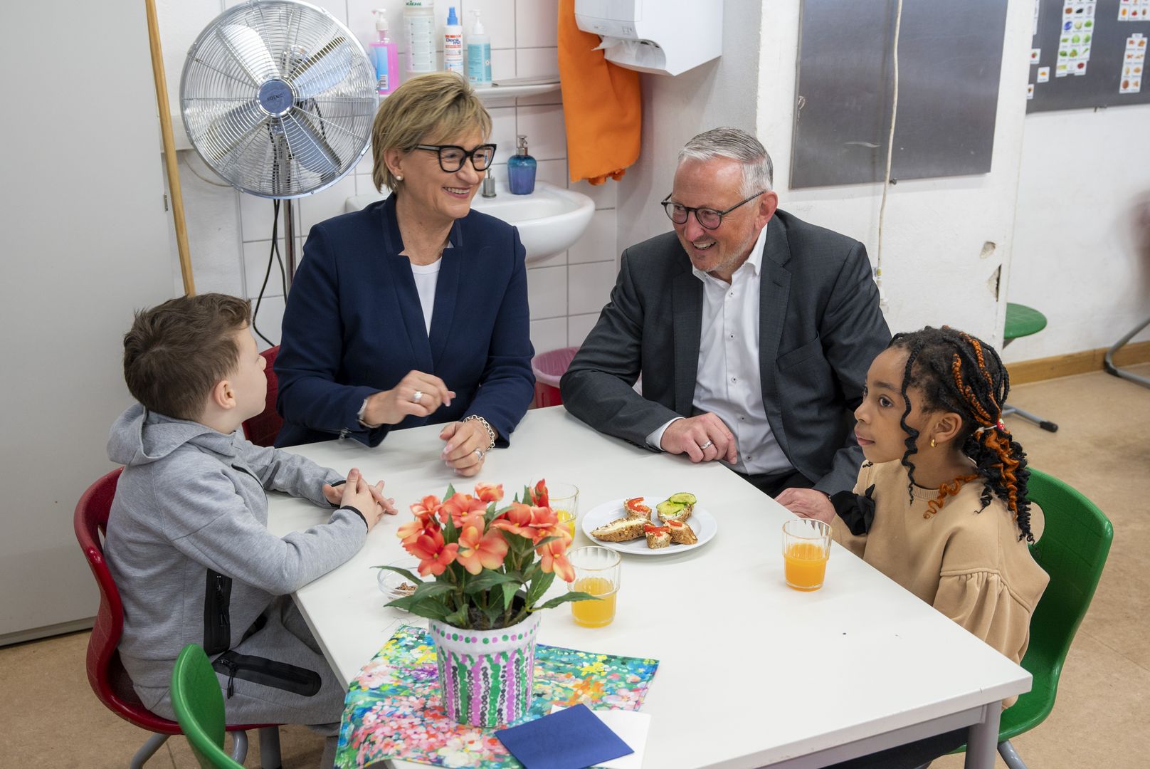 Zum Besuch kommen an diesem Tag gemeinsam mit Herrn Snay die BLLV-Präsidentin Simone Fleischmann und Sieglinde Stanzl, die Projektleiterin vom denkbar Schulfrühstück. Denn was die BLLV Kinderhilfe mit dem Frühstücksprojekt gemeinsam mit den Spendern und Unterstützern an mehr als 150 bayerischen Schulen leistet, muss man selbst erleben, um es wirklich nachvollziehen zu können.