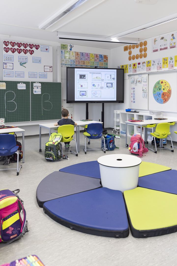 Im Schulhaus finden sich überall mobile Lernlandschaften, die flexibel eingesetzt werden können und so bewegtes Lernen und Austausch ermöglichen. Hier zeigte sich, dass auch in einem älteren Schulbau moderne Elemente zielgerichtet integriert werden können.